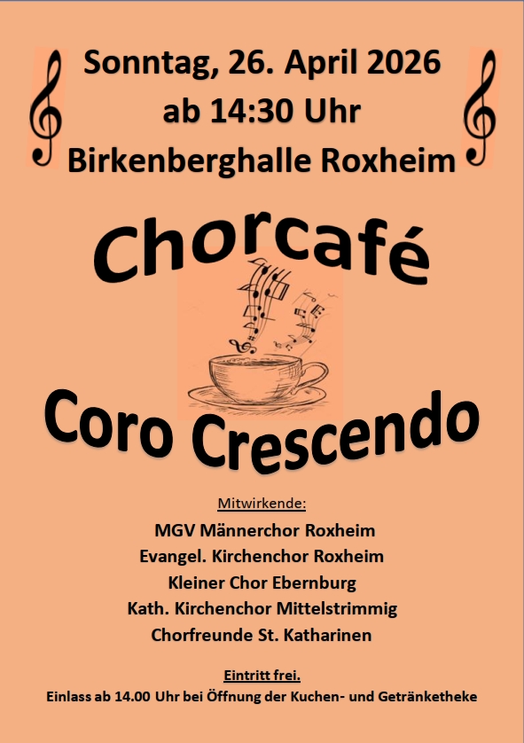 26. April 2026 (siehe nächster Beitrag) Chorcafé Coro Crecendo und Männerchor mit Ev. Kirchenchor Roxheim, Kleiner Chor Ebernburg Kath. Kirchenchor Mittelstrimmig, Chorfreunde St. Katharinen