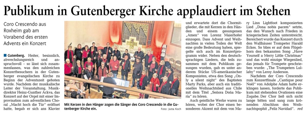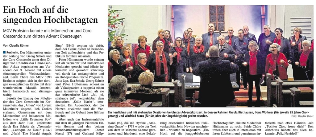 Die Allgemeine Zeitung Bad Kreuznach veröffentlichte am 6.Dezember 2019 den nachfolgenden Artikel anlässlich des bevorstehenden Jubiläums-Weihnachskonzertes des coro crescendo am 22. Dezember 2019…